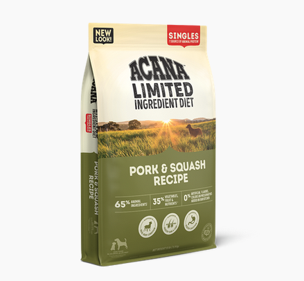 Our Pork & Squash recipe is crafted with 65% animal ingredients1 from protein-rich pork including raw pork and pork liver to satisfy your dog’s cravings, and it contains no grain ingredients2. It’s also balanced with nutritious, fiber-rich vegetables and fruit including whole butternut squash to help support your dog’s digestive health. Show your dog that a limited ingredient diet doesn’t mean less meat by feeding them ACANA Singles Limited Ingredient Diet Pork & Squash Recipe!