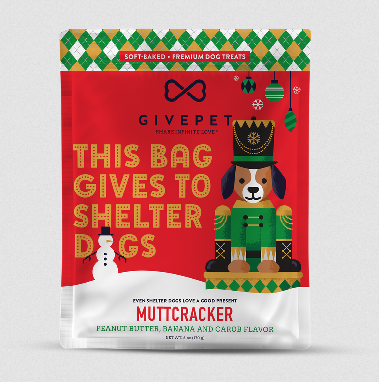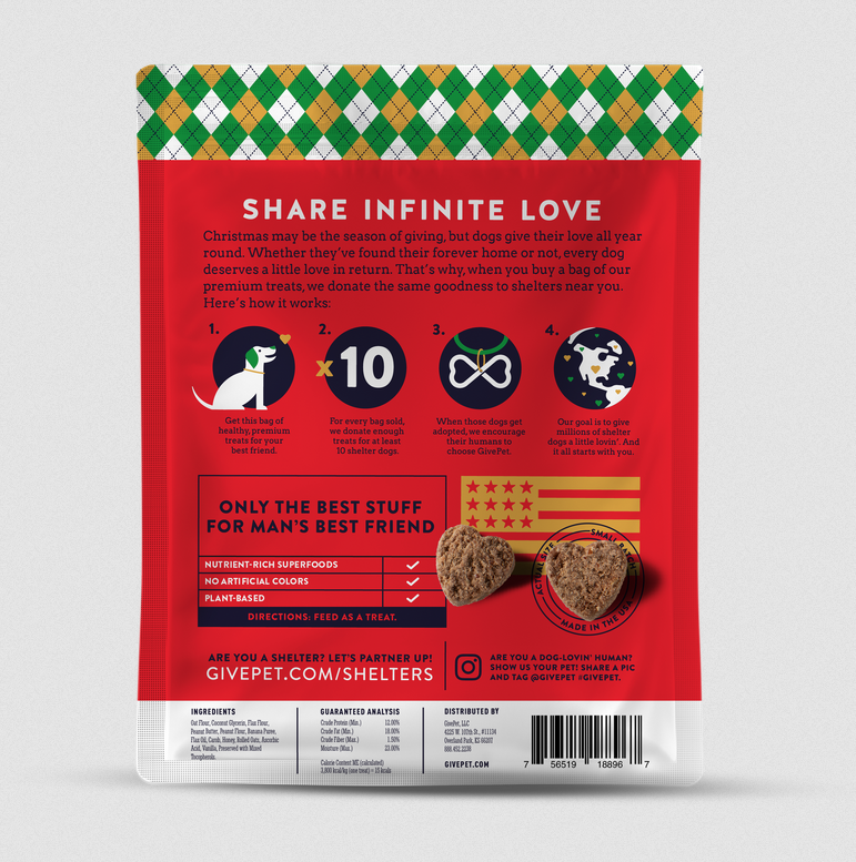 6 oz bag of holiday-themed soft baked treats. Made with nutrient-rich Whole Foods and superfoods. Peanut butter, banana and carob flavor.