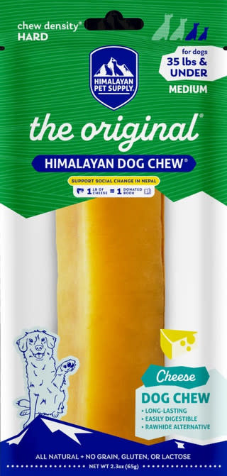 Himalayan Dog Chew® is the original® long lasting, hard smoked cheese chew. It was created from an ancient recipe and made using traditional methods with yak and/or cow milk. Dogs must work the end of the treat for hours, softening it with their mouths before small parts of it can be slowly chewed off. When you give this treat to your dog, you know that you are providing them with high-quality eating entertainment. When the chew becomes a small piece, take the leftover end away. Soak it in warm water for 5 minutes, heat in the microwave on high power for approx. 45 seconds to create a cheesy puffed treat. Let it cool for 2 minutes and treat your dog to a homemade puff!