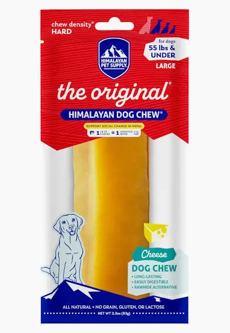 Himalayan Dog Chew® is the original® long lasting, hard smoked cheese chew. It was created from an ancient recipe and made using traditional methods with yak and/or cow milk. Dogs must work the end of the treat for hours, softening it with their mouths before small parts of it can be slowly chewed off. When you give this treat to your dog, you know that you are providing them with high-quality eating entertainment. When the chew becomes a small piece, take the leftover end away. Soak it in warm water for 5 minutes, heat in the microwave on high power for approx. 45 seconds to create a cheesy puffed treat. Let it cool for 2 minutes and treat your dog to a homemade puff!