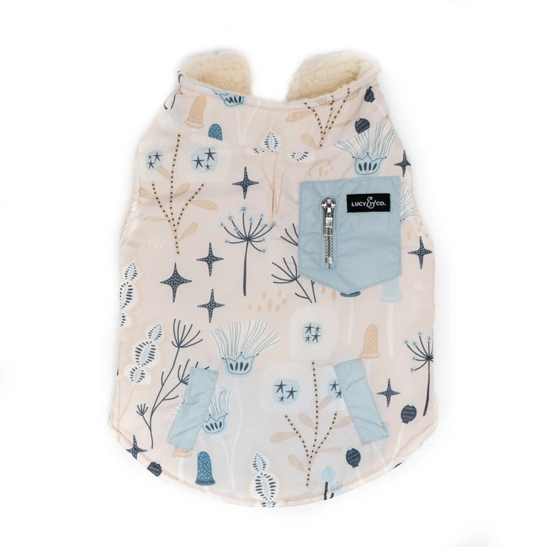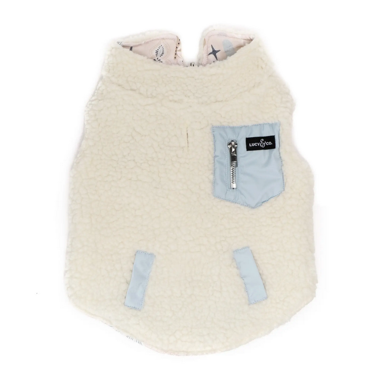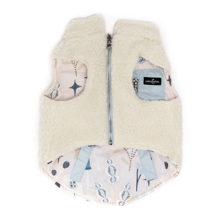 The at First Frost Reversible Teddy Vest will keep your pup warm and cozy and cute as can be. This fuzzy teddy vest jacket is sweeping winter wardrobes and blanketing its wearers in a big bear hug! We had the on-the-go dog in mind when we designed these: zip closures and a leash clasp opening on the back side of the vest make getting out the door easy.